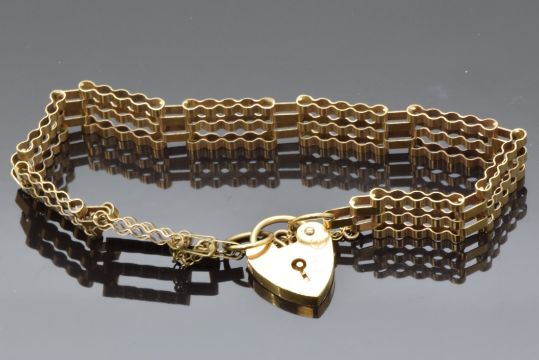 A 9ct gold gate bracelet with heart clasp, 7g