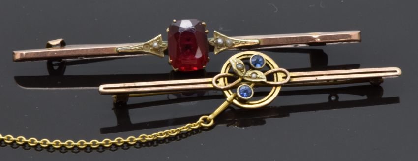 A 9ct gold brooch set with sapphires and seed pearls and 9ct gold brooch set with paste and seed pearls, 6g