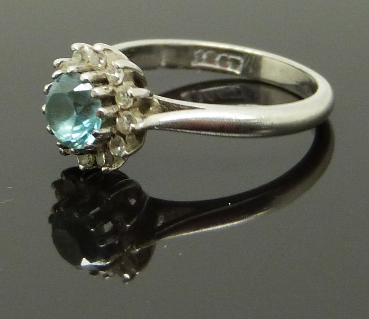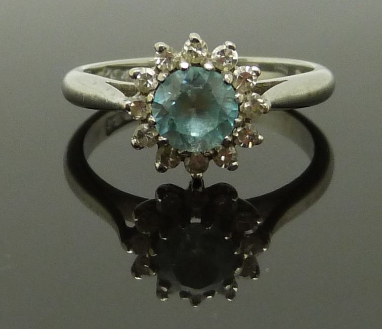 An 18ct white gold ring set with a round cut zircon surrounded by diamonds, 3.9g, size J/K