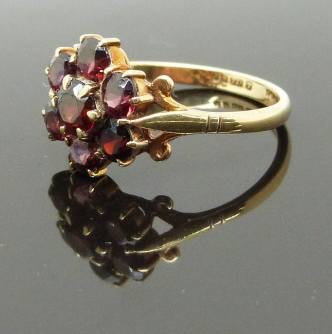 A 9ct gold cluster ring set with a cluster of garnets, size R, 3.00g