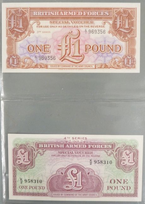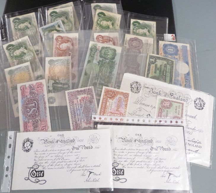 A collection of British banknotes, Peppiatt mauve ten shillings, blue one pound etc, replica white five pound one million, consecutive B.A.F notes etc, in an album