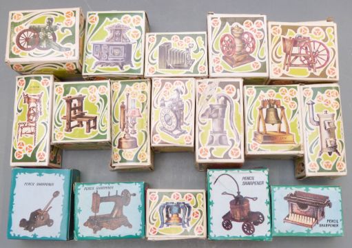 Seventeen vintage novelty pencil sharpeners in original boxes