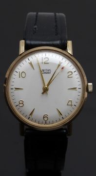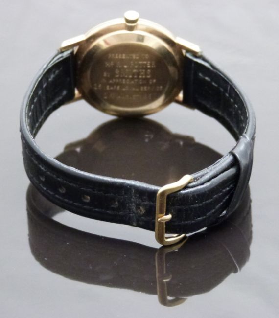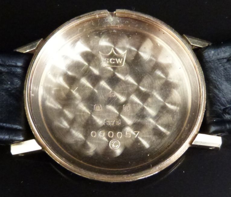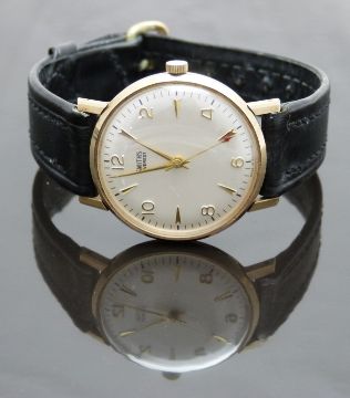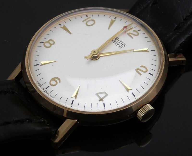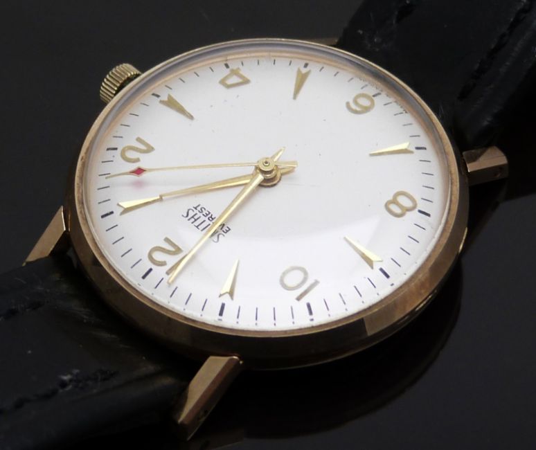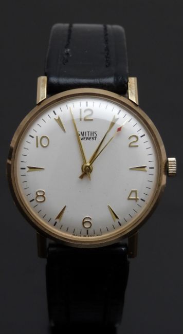 Smiths Everest 9ct gold gentleman's wristwatch with gold hands and Arabic numerals, silver dial and 17 jewel calibre 60466E movement, on black leather strap, case diameter 34mm, serial number 090057, hallmarked Edinburgh 1966, in original fitted box with outer cardboard box.