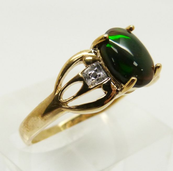 A 9ct gold ring set with an oval Mezezo opal cabochon and diamonds, 3.2g, size T