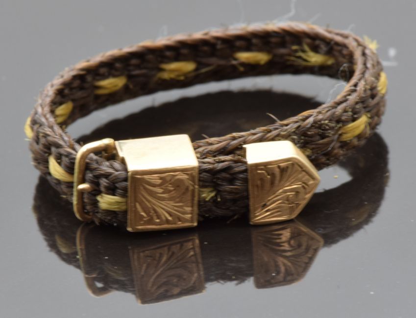 Victorian plaited hair mourning ring with gold buckle decoration