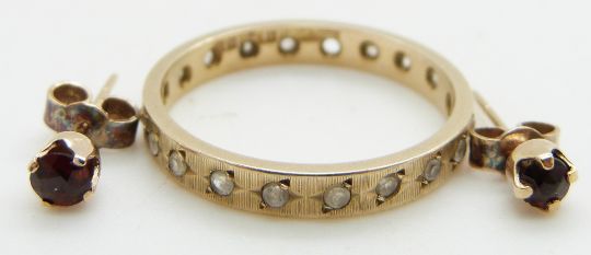 A 9ct gold eternity ring (size N/O) and a pair of 9ct gold earrings set with a garnet to each, 2.8g