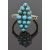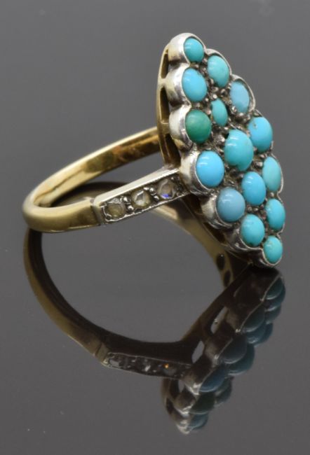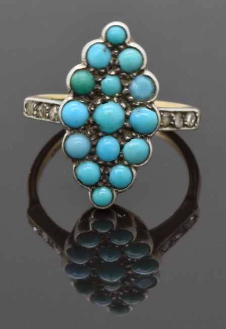 Victorian 18ct gold ring set with turquoise cabochons and diamonds to the shoulders, size P, 5.68g