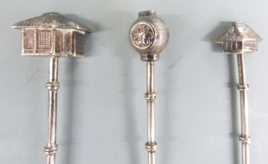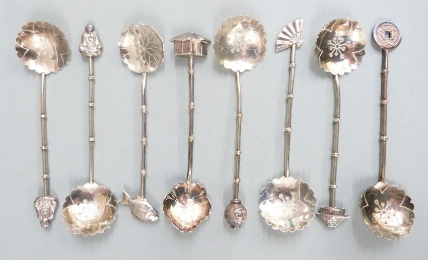 Set of sixChinese white metal teaspoons with fan, building and other finials, maked Sterling together with two similar spoons, weight 50g