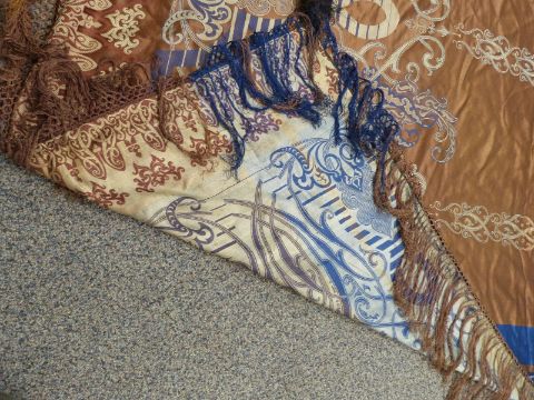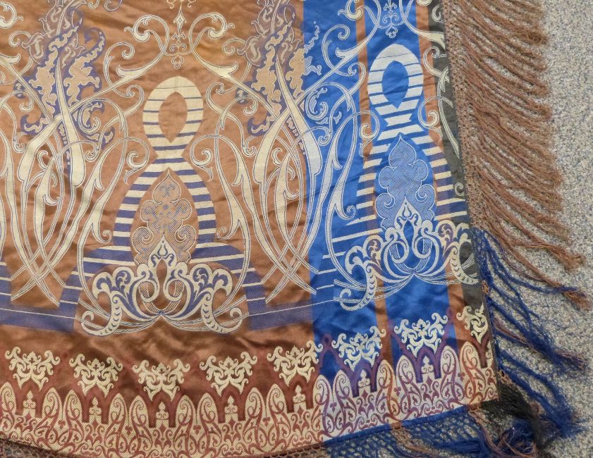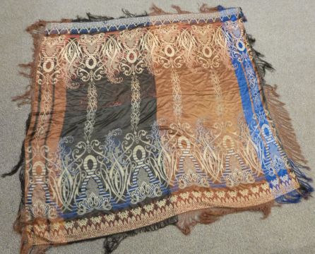 Victorian / Edwardian woven silk shawl with Art Nouveau / Secessionist pattern and hand woven fringe, 190 x 180 cm