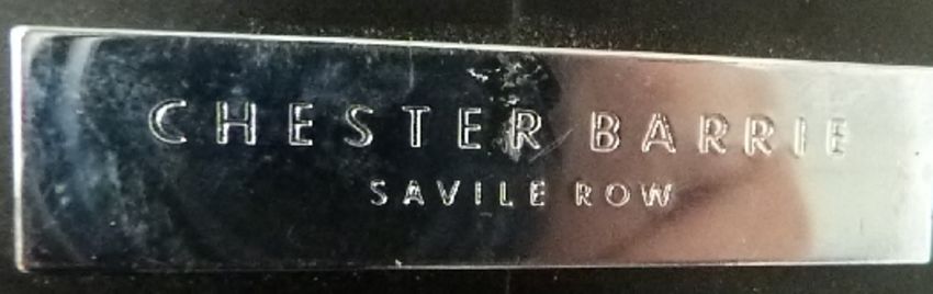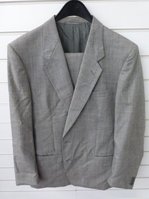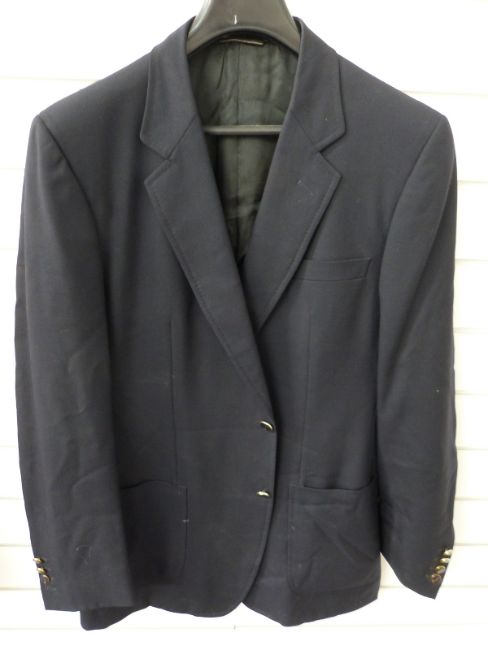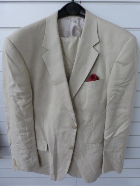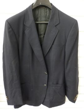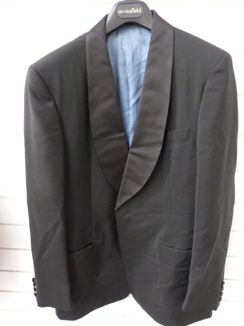 A collection of gentleman's suits etc comprising Chester Barrie two piece grey linen suit the trousers size 38R, Gurten two piece linen suit size 44L, Dunhill London navy wool jacket with Dunhill 'd' buttons, a dinner jacket, one other grey Italian wool suit and a Christian Dior shirt