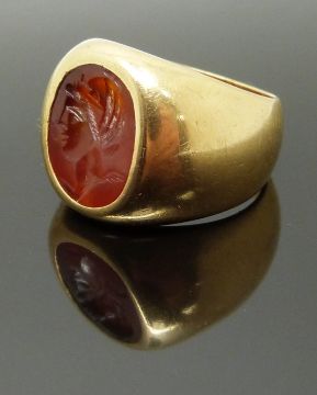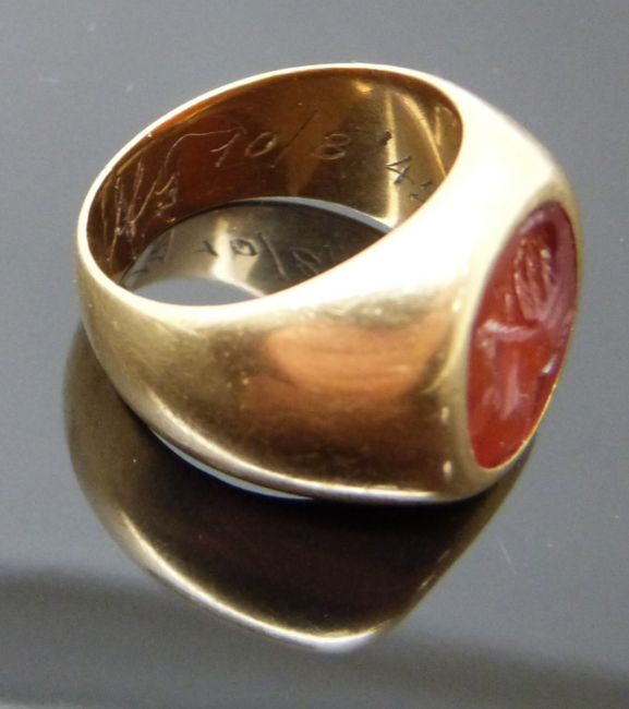A yellow metal ring set with a carnelian agate intaglio, size M/N, 18.10g