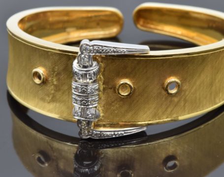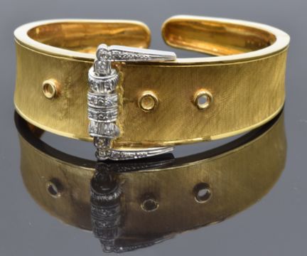 A yellow metal bangle in the form of a buckle set with diamonds, 26.5g