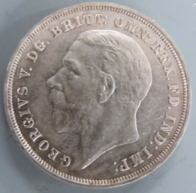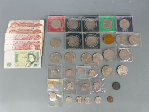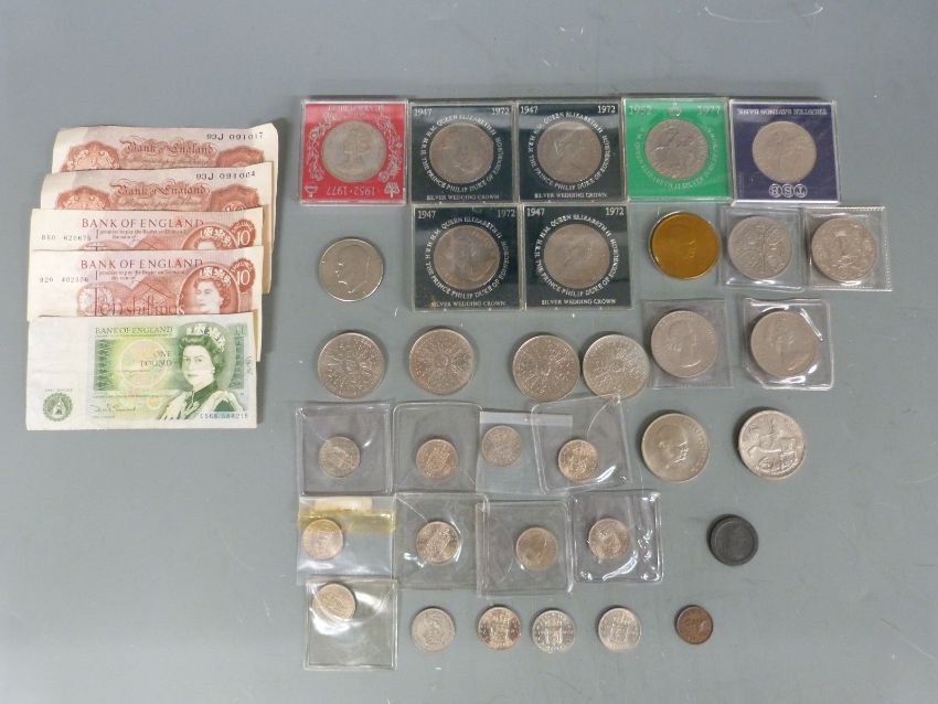 George V 1935 rocking horse crown together with a collection of modern commemorative crowns, sundry UK coins including George III Isle of Man halfpenny, banknotes etc