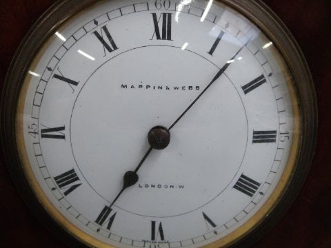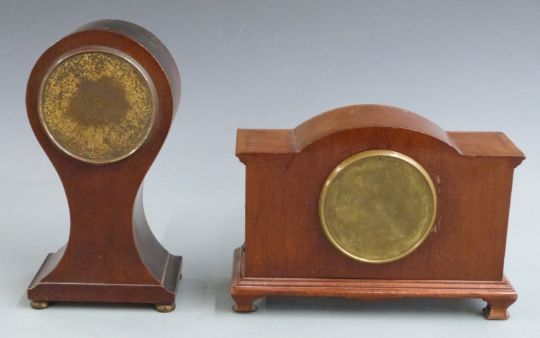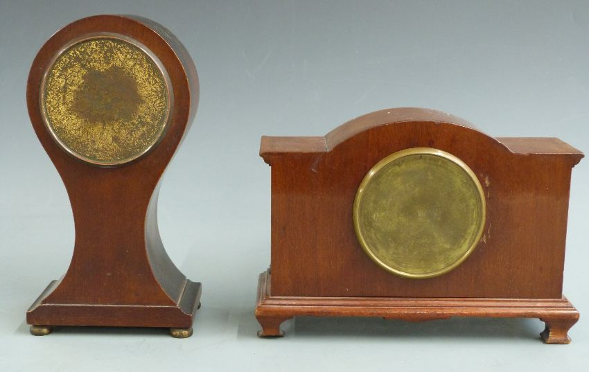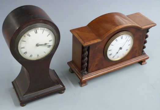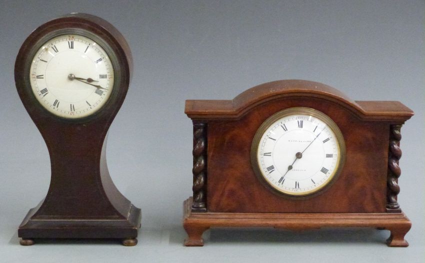 A late 19thC French balloon cased mantel clock with Roman enamelled dial, red Arabic quarters and spade hands, the mahogany case raised on bun feet, the movement stamped R & Co, Paris together with a French mantel clock in walnut case with barley twist decoration, the enamelled Roman dial with Arabic quarters signed Mappin and Webb, London, raised on bracket feet, 17cm tall