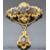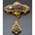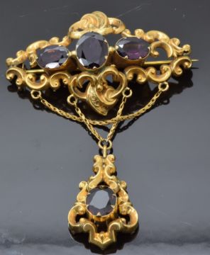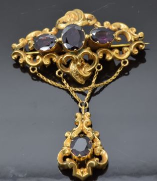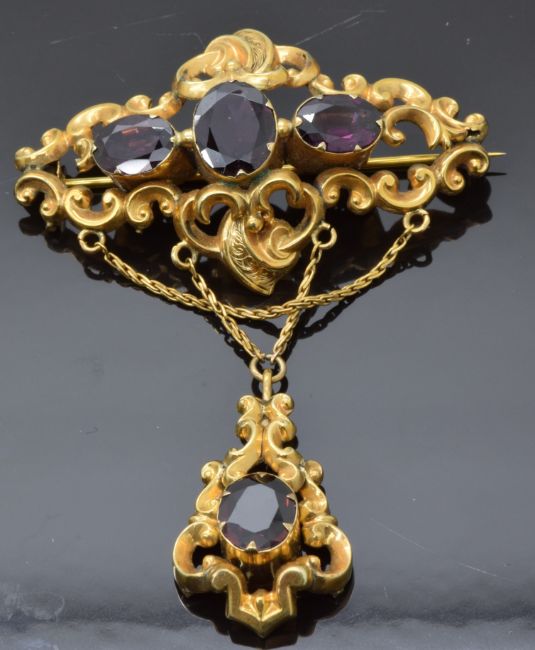 Victorian brooch with scrolling decoration set with large oval cut garnets, 5 x 7.5cm