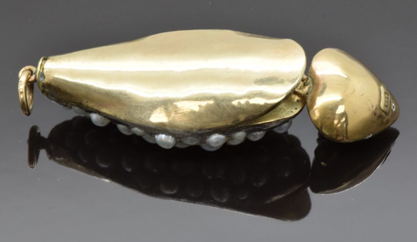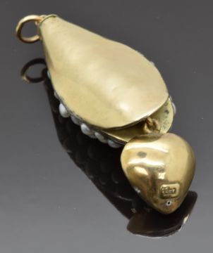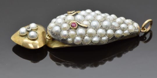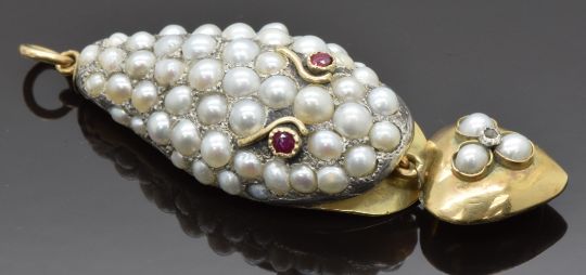 Victorian 9ct gold pendant in the form of a snake or serpent set with split pearls and ruby eyes, holding in its mouth a heart shaped drop pendant also set with three split pearls and a diamond, length 6cm