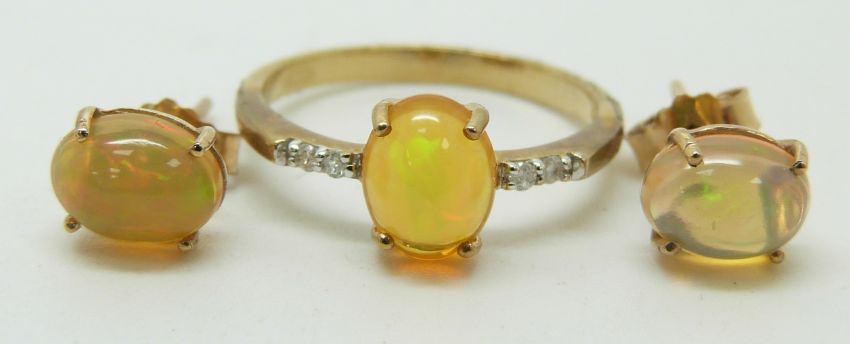 A 9ct gold ring set with an oval opal cabochon and diamonds (size N) with a pair of similar earrings