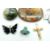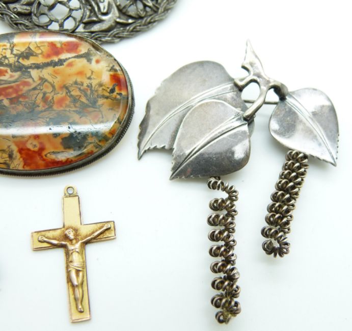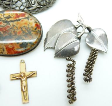 Danish silver brooch by Anton Michelsen and signed Nougee for Gertrud Engel, moss agate brooch, silver J A & S enamel butterfly brooch, malachite stud, Edwardian 9ct gold crucifix (Birmingham 1904)(1.7g) and a large Miracle brooch