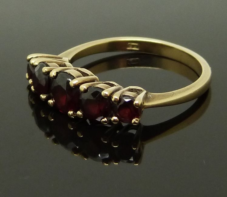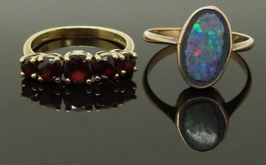 A 9ct gold ring set with garnets and another 9ct gold ring, size N & Q, 5.10g