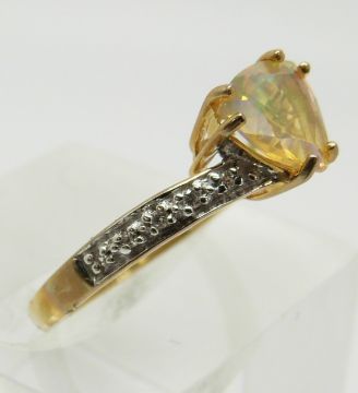 A 9ct gold ring set with a trilliant cut opal and diamonds, 1.7g, size M