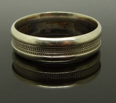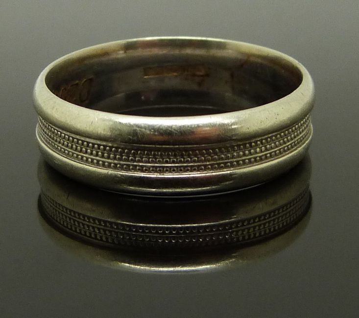 A 9ct white gold wedding band/ ring with textured decoration, size S, 5.11g