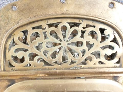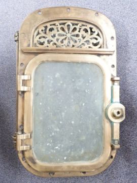 Early 20th century bronze ship's window or porthole with wheel operated ventilator mechanism to top behind a decorative grille, believed ex SS Copenhagen, similar to the examples fitted to the Cunard RMS Lusitania but smaller, the two ships were both built at John Browns, Clydebank, height 90cm, width 56cm