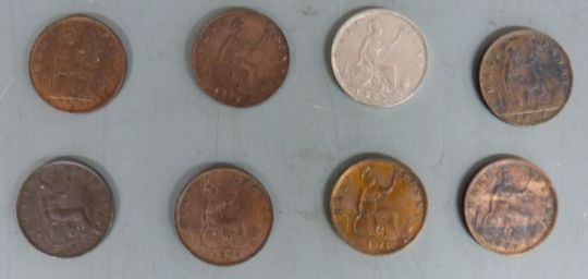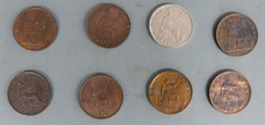 A collection of eight high grade Victorian halfpennies to include 1868 rose brooch example struck in silver colour metal 1874 VF, three 1876 Heaton Mint EF-near uncirculated, and three 1877 VF- near uncirculated