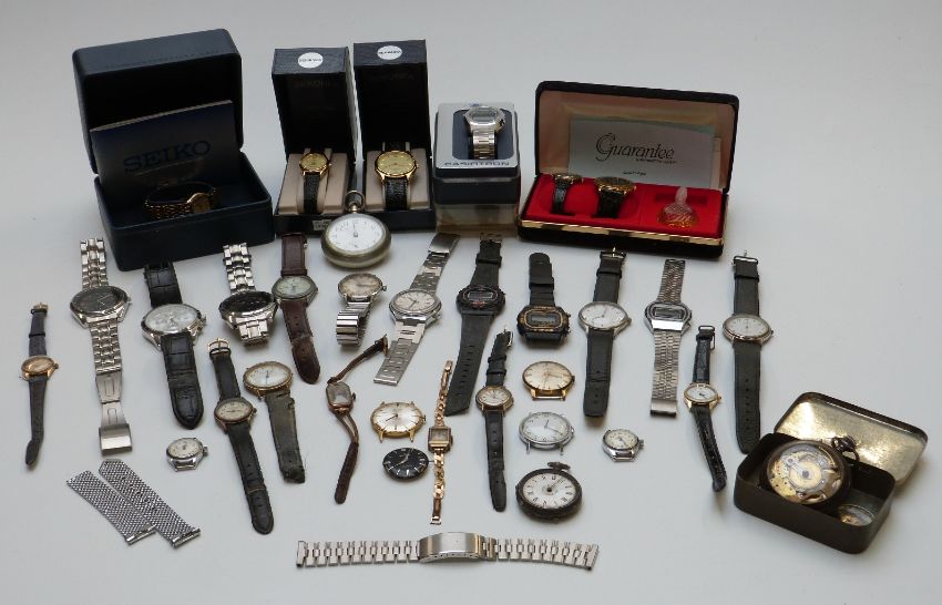 Thirty-three various ladies and gentleman's wristwatches including a ladies 9ct gold example, Casiotron, Legion automatic, Ruhla, Smiths, Services etc, some in original boxes.