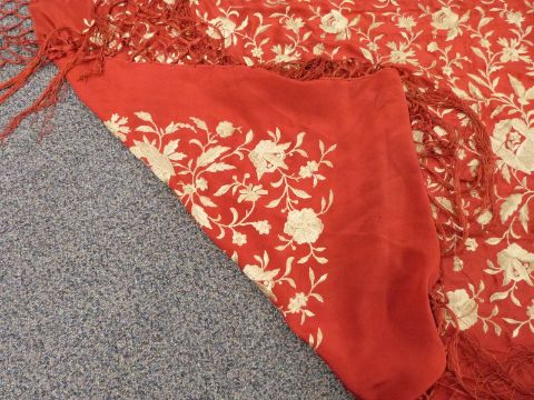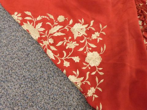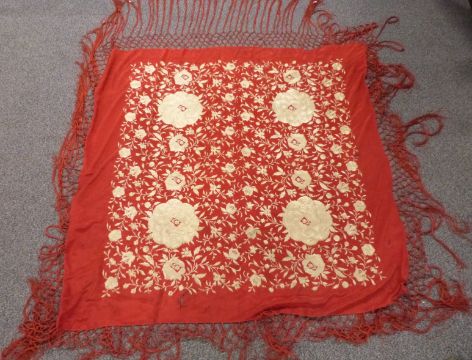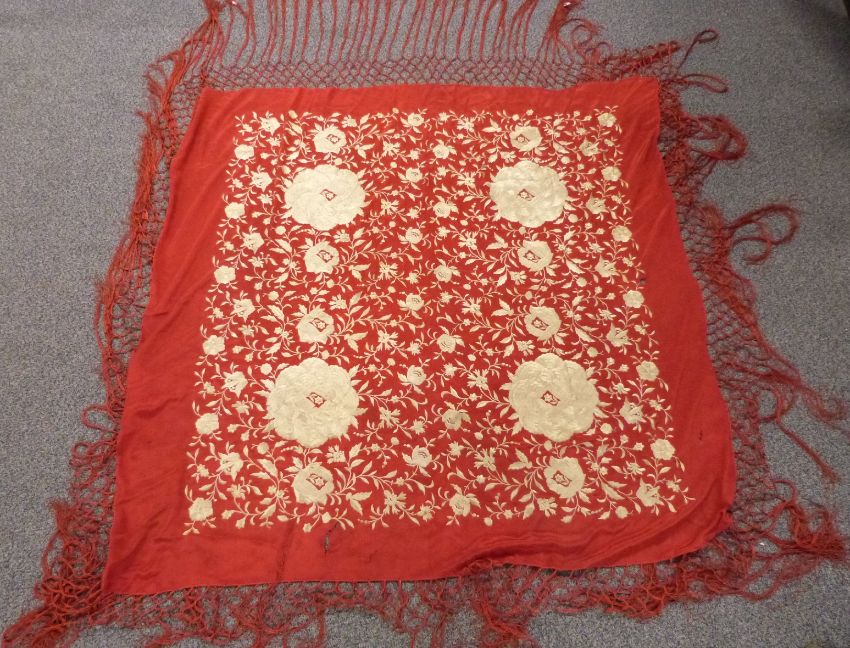 A 19th/20thC Chinese red shawl with embroidered chrysanthemum decoration and long fringe, 185 x 185cm including fringe