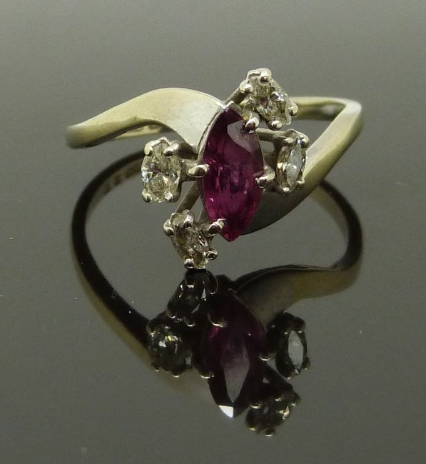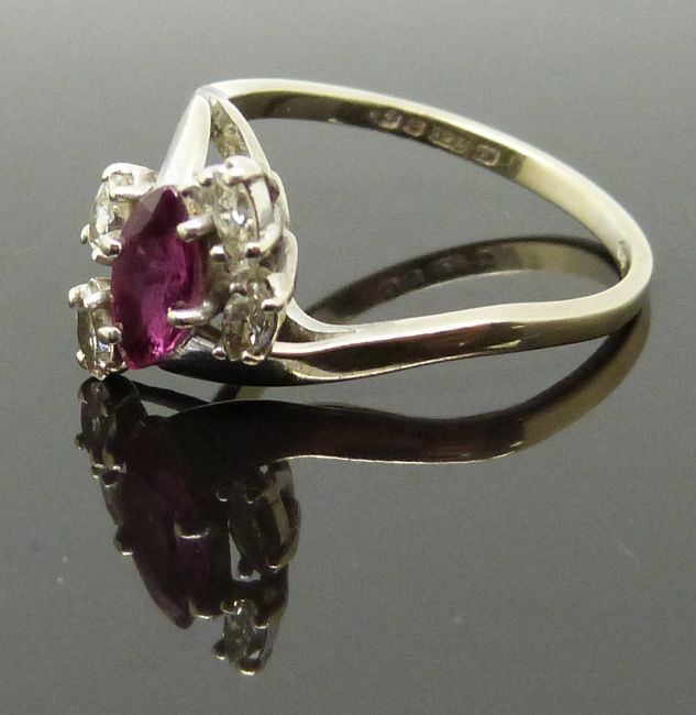 An 18ct white gold ring set with a marquise cut ruby and diamonds, in Martin & Co box, 3.1g, size O