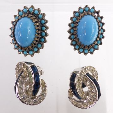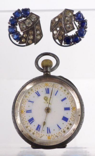 A pair of French silver earrings set with paste, a pair of Boucher earrings and one other pair, together with a silver fob watch and vintage stud box
