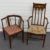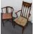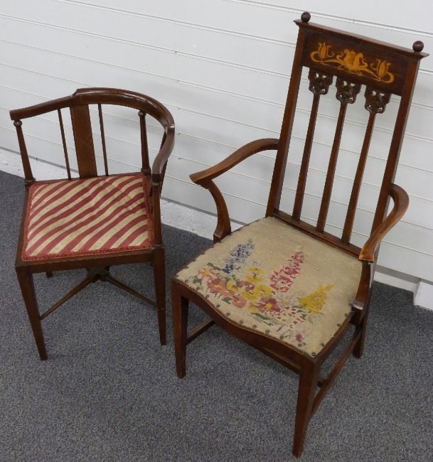 Edwardian Art Nouveau Liberty style mahogany armchair with inlaid decoration and floral tapestry upholstery, together with a similar corner chair.