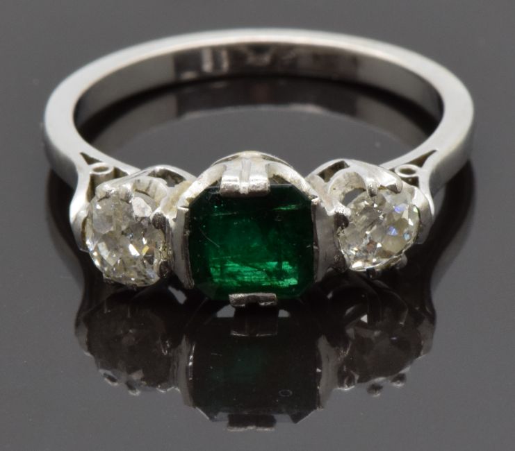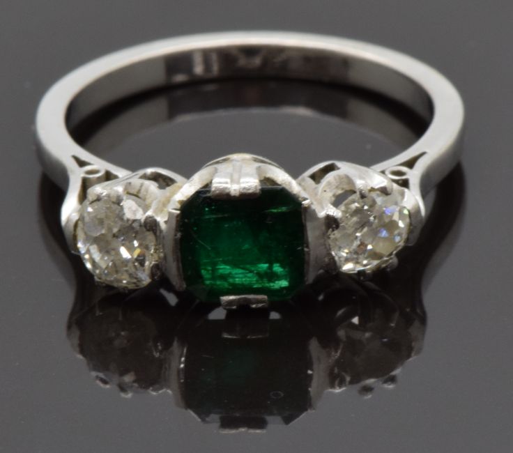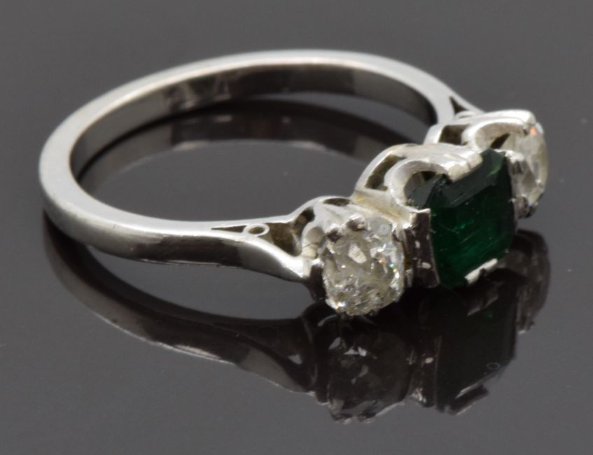 An 18ct white gold ring set with an emerald cut emerald of approximately 0.8ct and two diamonds, each approximately 0.3ct, 4.4g, size O