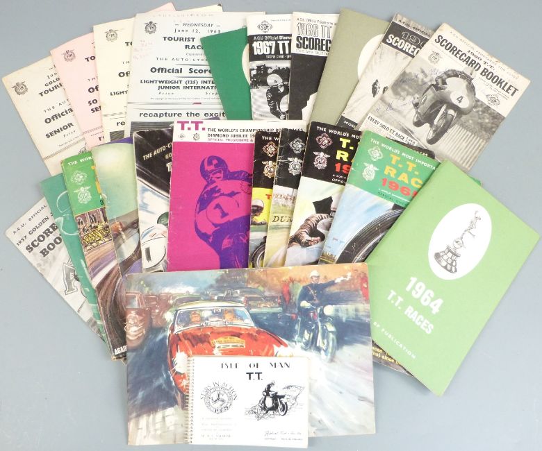 Collection of books and ephemera relating to motor sport and motorcycle racing including 1950s Isle of Man TT, Cotswold Scramble and other programmes, some signed including by Stanley Woods, Barry Sheen and others, stock car racing programmes for Swindon c1960s, car handbooks etc