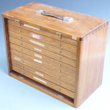 Mahogany nine drawer collector's cabinet with removable front and carry handle, W44 x D24 x H35cm.