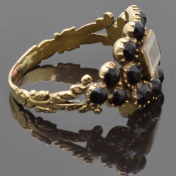 Georgian / Victorian mourning ring set with plaited hair in a glass compartment surrounded by French jet, size P, 2.80g