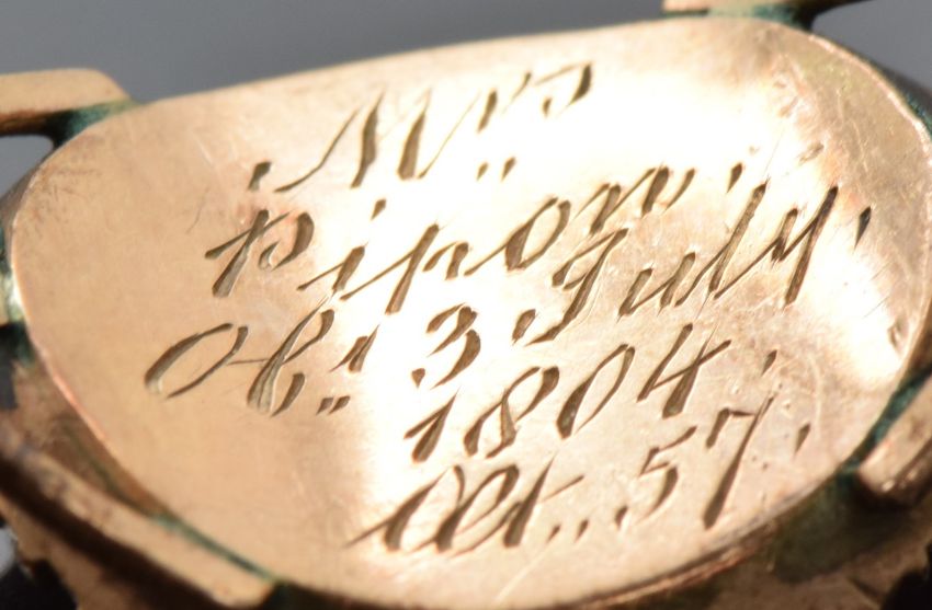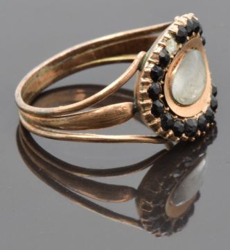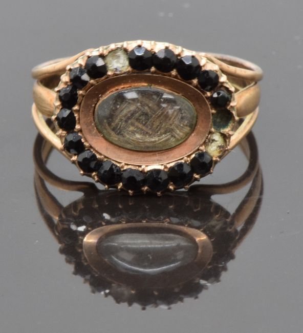 Georgian mourning ring set with plaited hair to the to the central glass compartment surrounded by French jet, inscribed "Ob 3rd July 1804 at 57", size N, 3.20g