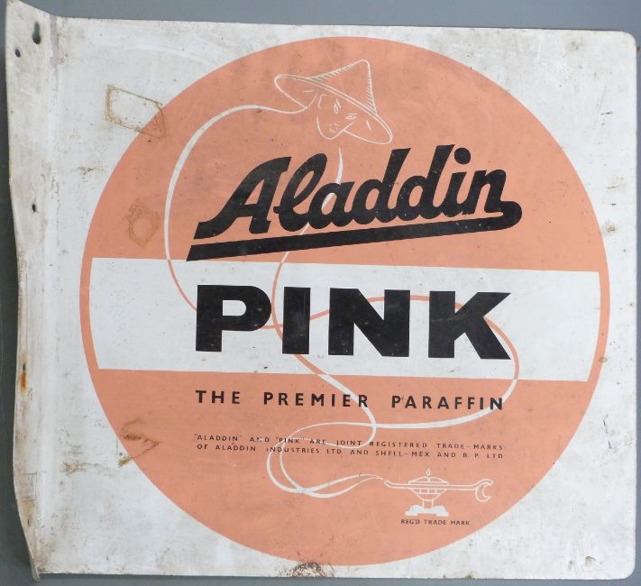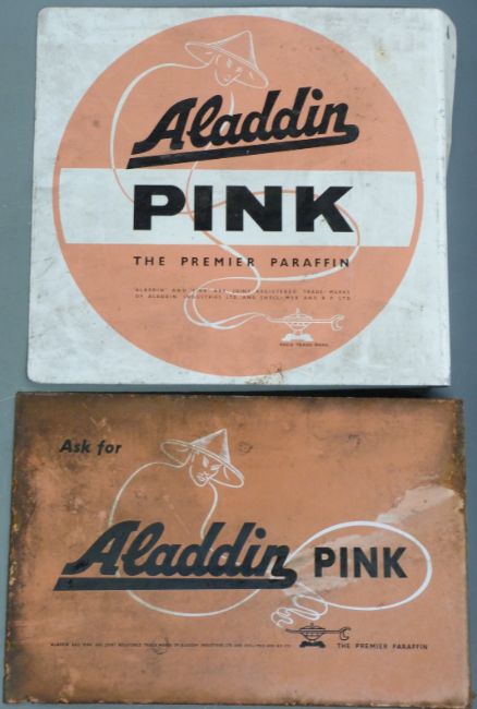 Two Aladdin Pink paraffin double sided vintage signs, one enamel 30 x 46cm the other marked A/5/66, 40 x 43cm