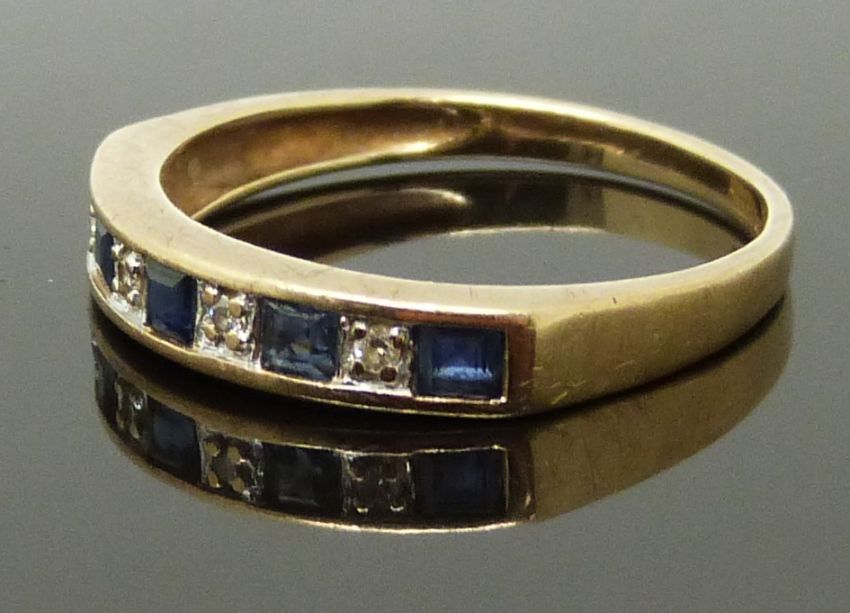 A 9ct gold half eternity ring set with square sapphires and diamonds, size N, 1.75g