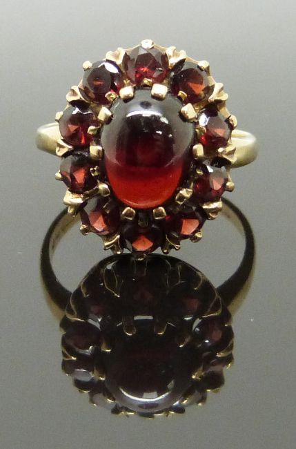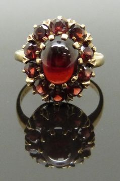 A 9ct gold ring with an opal cabochon surrounded by further garnets, size K, 3.89g