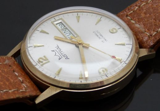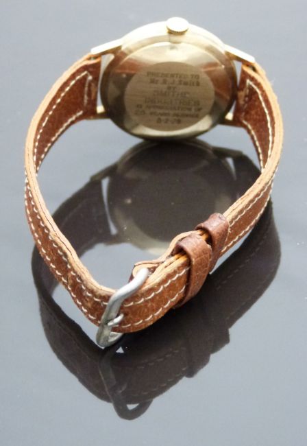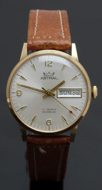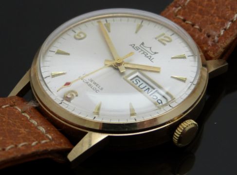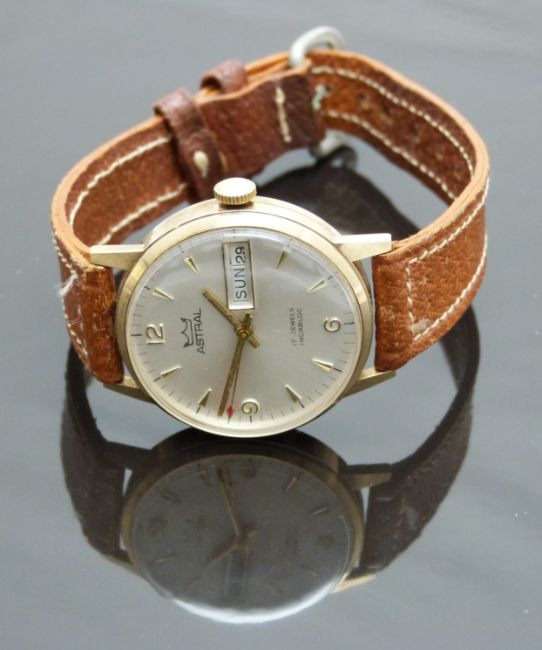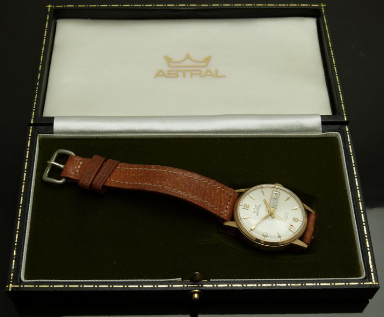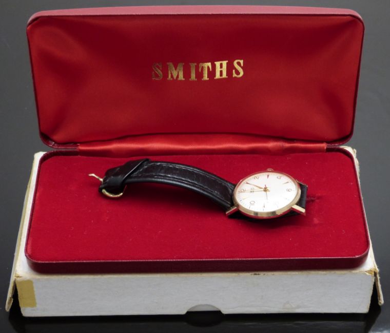 Smiths Astral 9ct gold gentleman's automatic wristwatch with day and date aperture, gold hour and minute hands, red tipped centre seconds hand, silver dial and 17 jewel calibre 2066 movement, on brown leather strap, case diameter 32mm, serial number 2214/1, in original box.