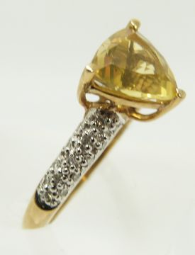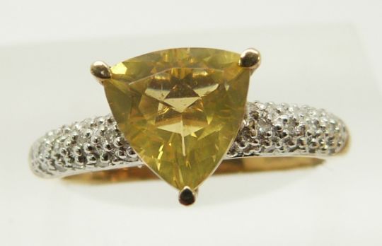 A 9ct gold ring set with a trilliant cut fire opal and diamonds, 2.3g, size N