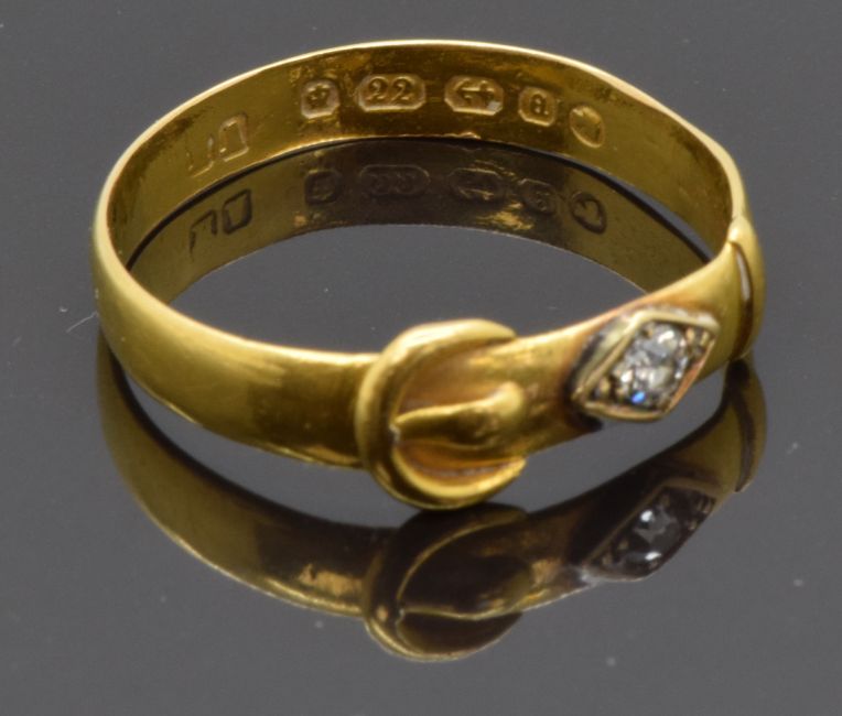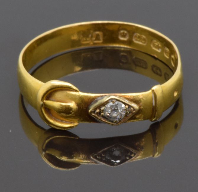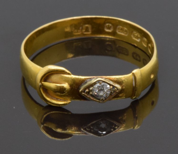 Victorian 18ct gold buckle ring set with a diamond, Birmingham 1900, size O, 2.46g