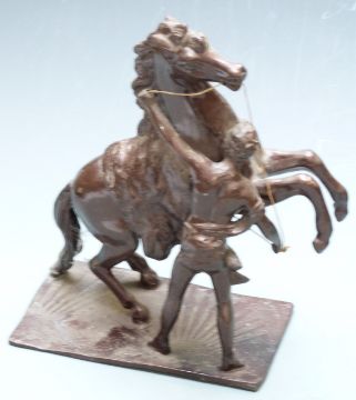 Pair of spelter figures of rearing horses with their handlers, height 25cm