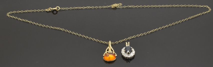 A 9ct gold pendant set with pressed amber and another 9ct gold pendant set with a sapphire, 4g