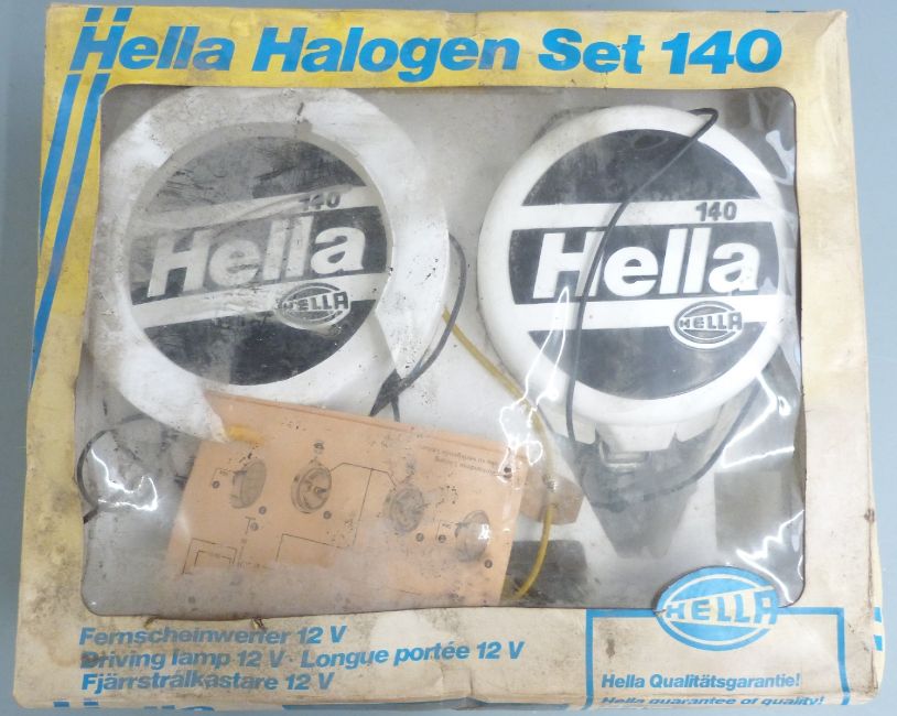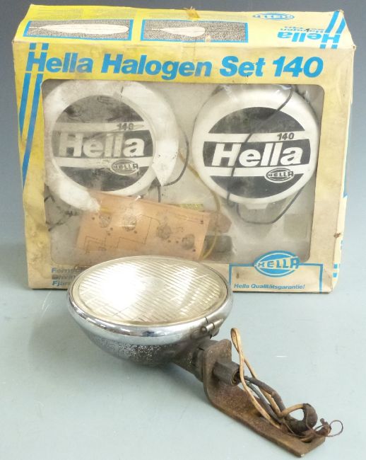 Hella Halogen Set 140, pair of car rally spotlights in original box and a Lucas spotlight