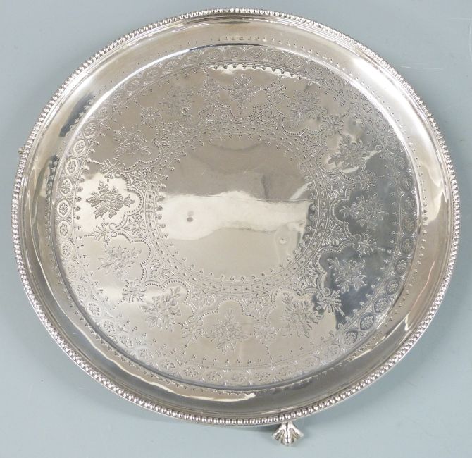Victorian hallmarked silver circular salver with beaded edge, engraved decoration and raised on three ball and claw feet, London 1879 maker Henry John Lias & James Wakely, diameter 25.5cm, weight 527g