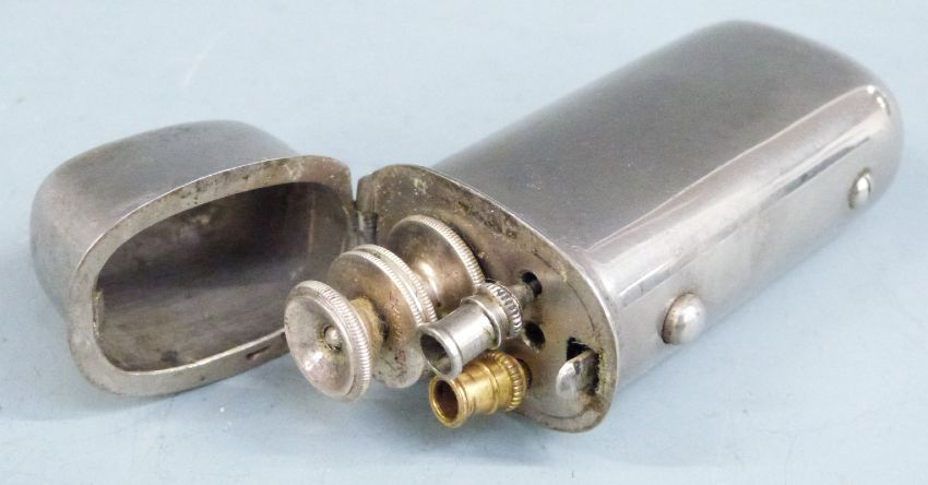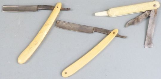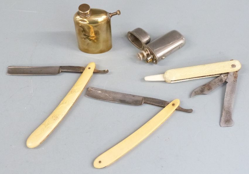 Two cut throat razors, both marked J.A.Hellberg Eskilstuna Garanti, further folding knife, Flamidor oil bottle or lighter and a travelling syringe in case