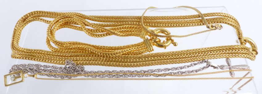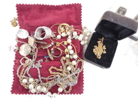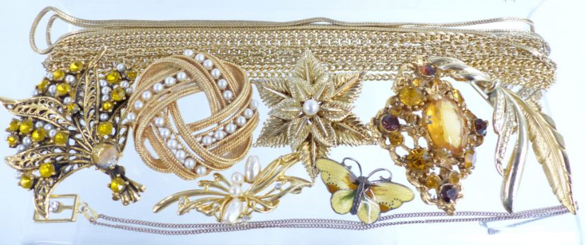 A collection of jewellery including vintage brooches, Norwegian butterfly brooch set with enamel, silver necklace and cross, silver cufflinks, 9ct gold eternity ring, 9ct gold earrings, etc