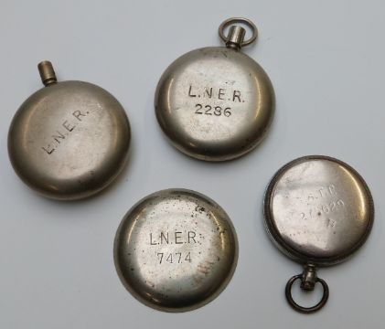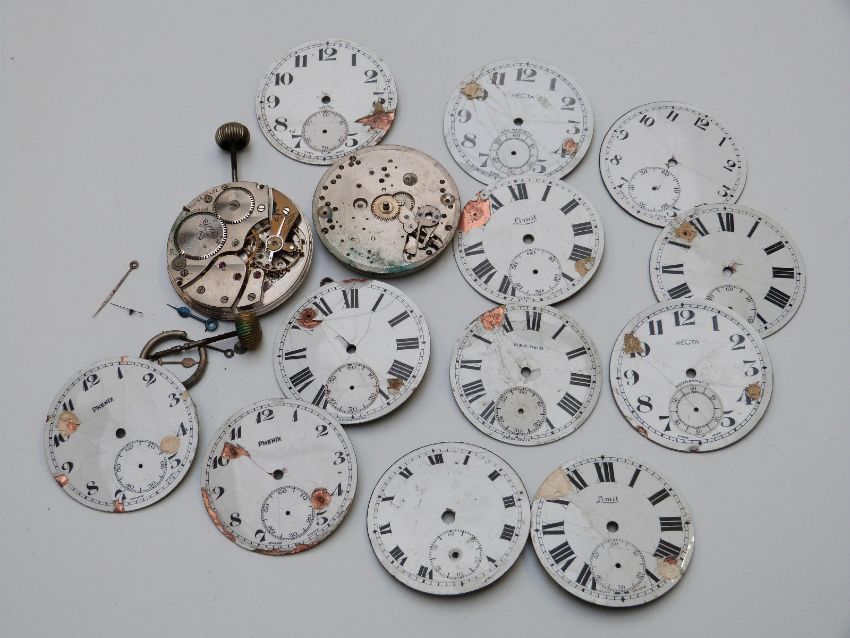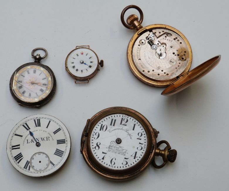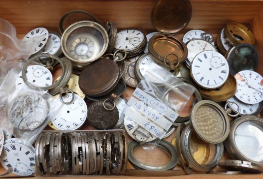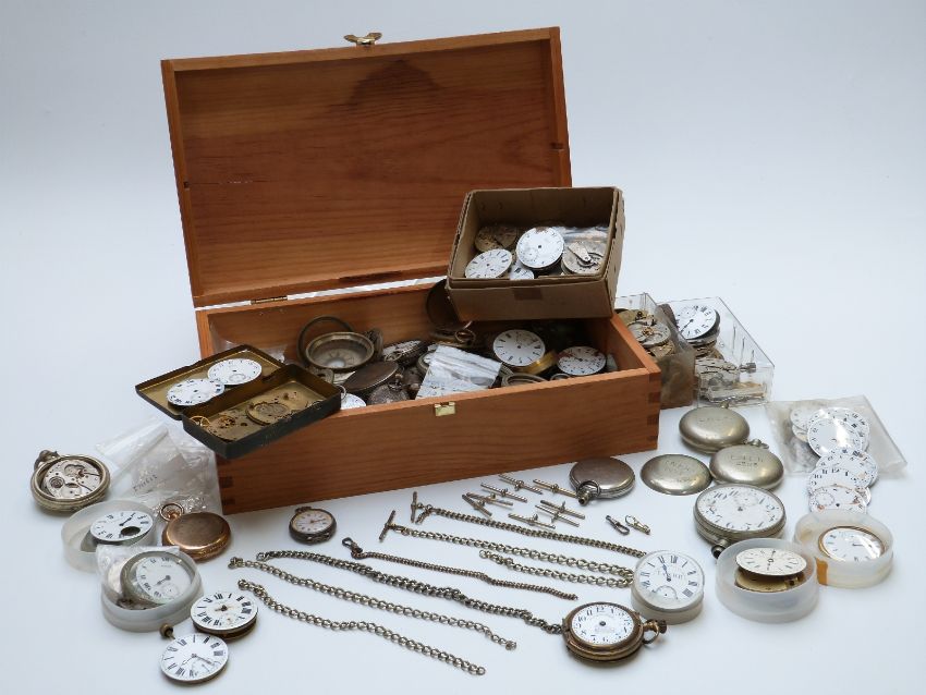 A large quantity of incomplete pocket watches, dials, movements and cases etc, includes stamped L.N.E.R and three with ministry mark, Albert chains etc